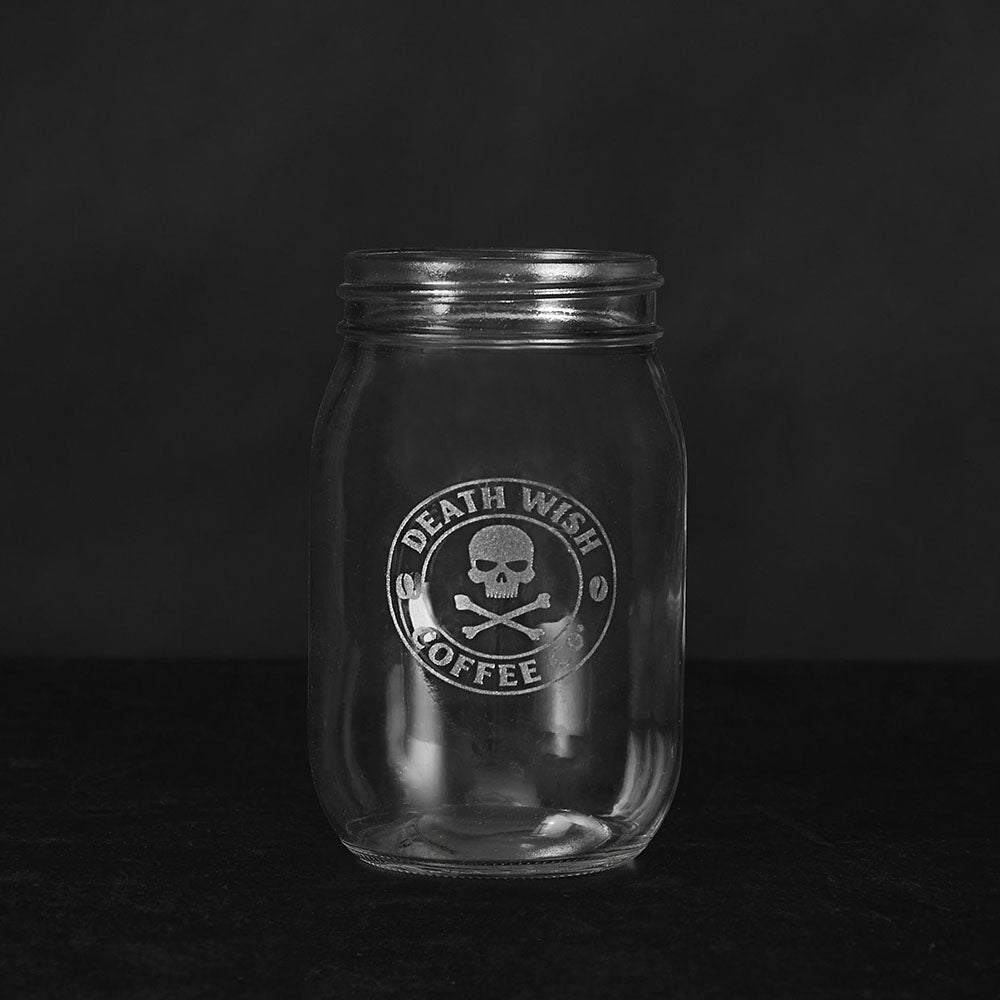 - Clear mason jar with a laser engraved Death Wish Coffee logo.