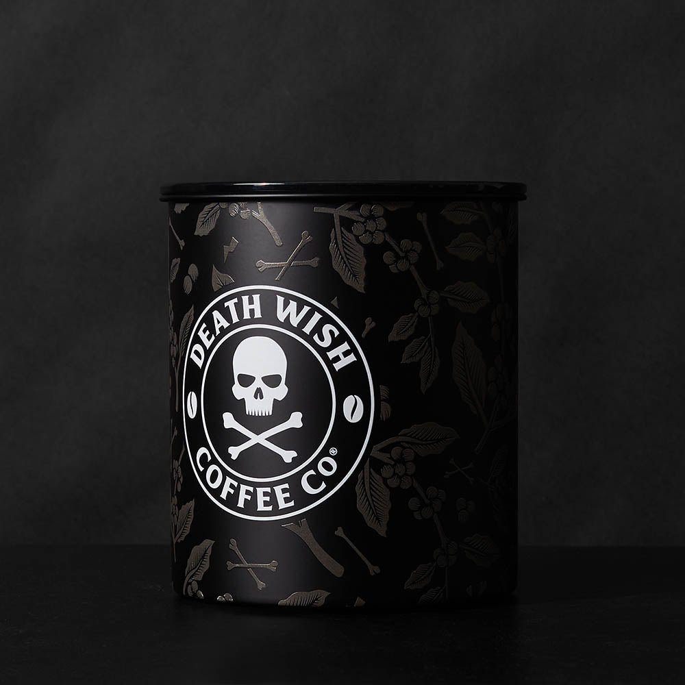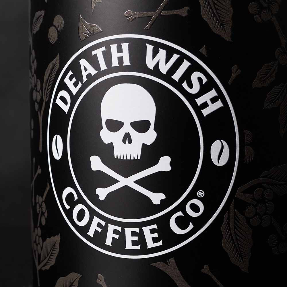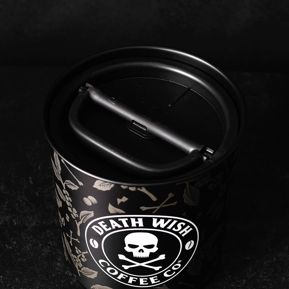- Matte black stainless steel base with Death Wish Coffee logo and botanical pattern wrapping from front to back.
