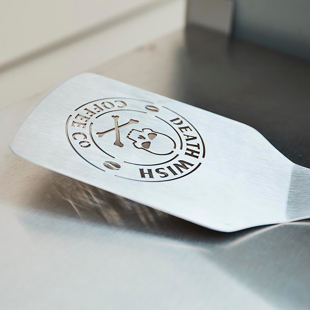 - Metal spatula with a Death Wish Coffee Co. wordmark printed on the handle and skull and crossbones logo etched into the blade.