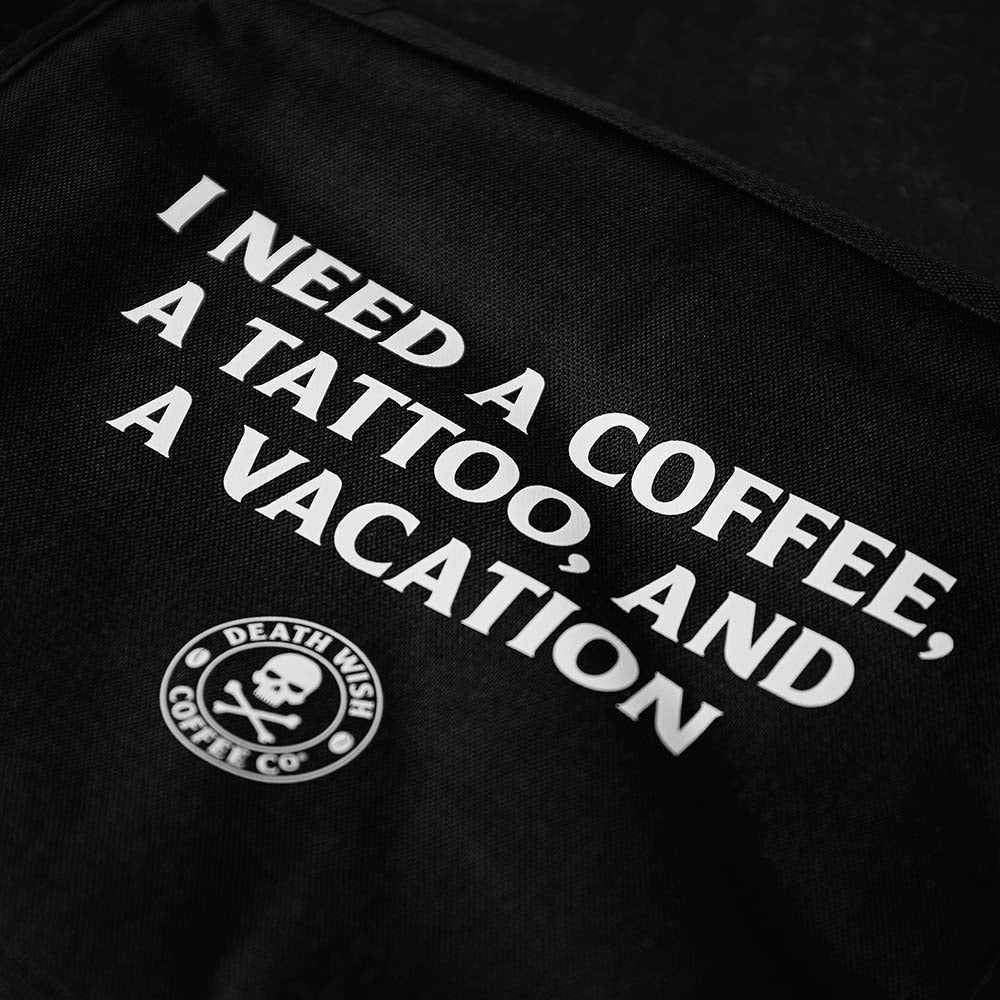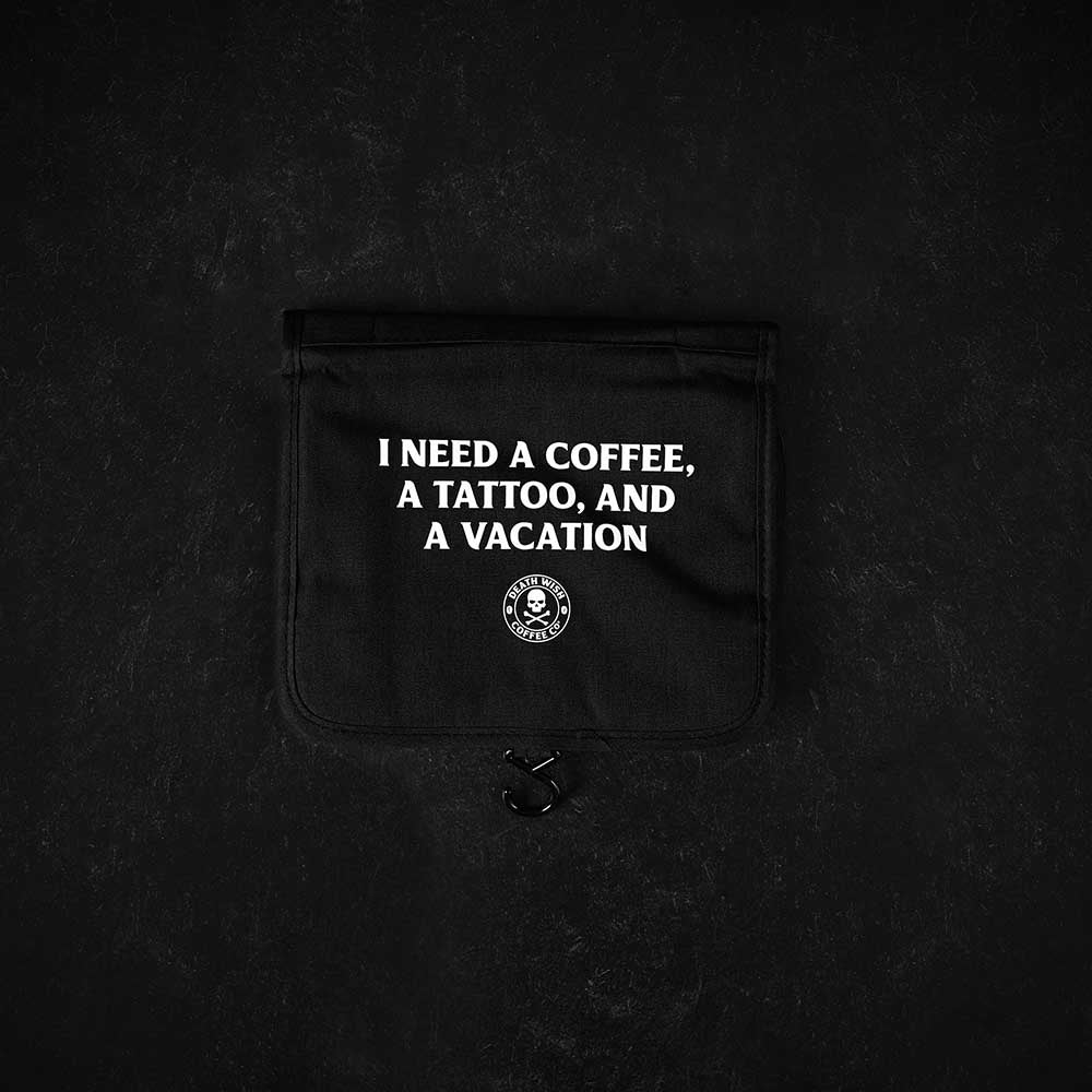 - Black Death Wish Coffee travel bag with meme style "I need a coffee, a tattoo and a vacation" phrase.